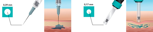 Технология С помощью энергии механического действия, пружина и особенный поршень в шприце (инъекторе) позволяют под давлением быстро, но плавно протолкнуть струю препарата через микроскопическое отверстие в подкожную ткань без прокалывания иглой. Диаметр отверстия в ампуле ИНЖЕКС всего 0.17 миллиметра, вдвое тоньше диаметра самых тонких игл для инсулина.